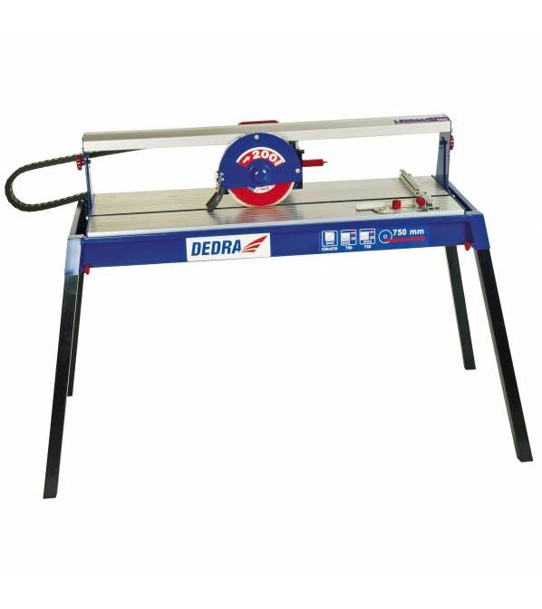 Plytelių pjovimo staklės Dedra DED7828. Variklio galia 850 W, išorinis disko skersmuo 200 mm, vidinis tvirtinimo disko skersmuo 25,4 mm. Pjaunamos plytelės storis (90°/45°) - 36/29 mm. Apsukų skaičius tuščiąją eiga 2950 min-1. Maksimalus apdirbamos plytelės ilgis 750 mm. Darbo stalo matmenys - 990x394 mm. Svoris 30 kg.